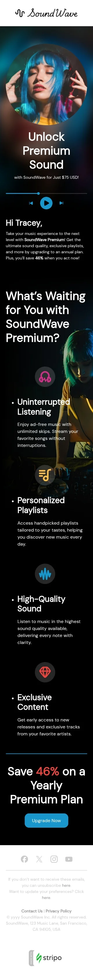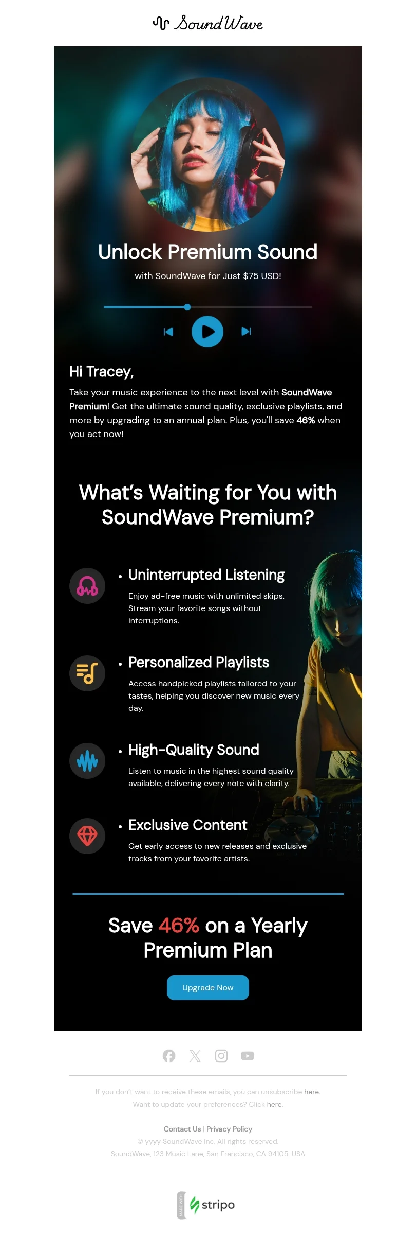 Upselling von Jahresplänen E-Mail-Vorlage «Schalten Sie Premium-Sound frei» für Musik-Branche