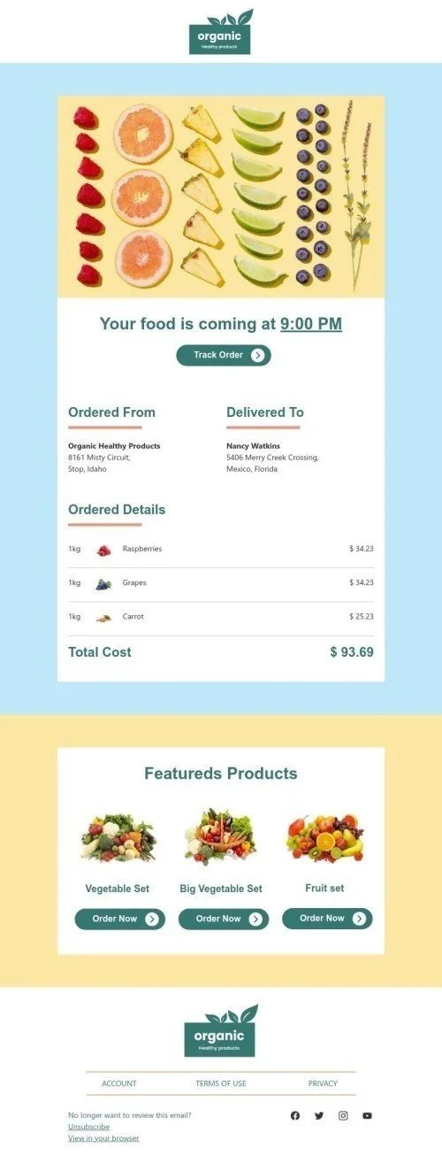 Halten Sie Ihre Kunden über den Status ihrer Lebensmittelzustellung mit unserer Vorlage "Ihr Essen kommt" auf dem Laufenden. Perfekt für die Lebensmittelindustrie, wird diese automatisierte E-Mail eine Nachricht des Unternehmens enthalten, die die Kunden darüber informiert, dass ihre Bestellung vorbereitet wird und bald geliefert wird. Sie enthält auch einen Link, damit die Kunden den Fortschritt ihrer Bestellung verfolgen können, sowie eine geschätzte Lieferzeit. Diese Vorlage ist einfach anzupassen und wird dazu beitragen, die Kundenzufriedenheit und das Vertrauen zu verbessern, indem sie alle notwendigen Informationen für eine erfolgreiche Lieferung bereitstellt.