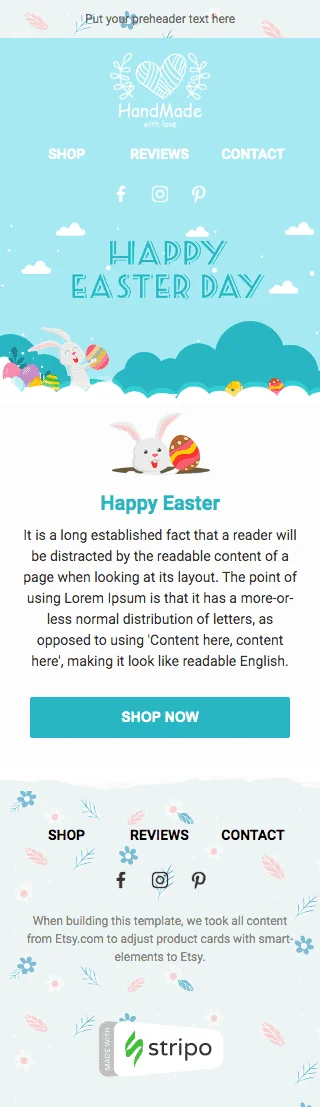 Hop into Ostern with our "Easter Bunny" email template designed for the Ecommerce industry. This customizable template features sections to showcase your latest Easter-themed products and promotions, from colorful Easter eggs to bunny-shaped chocolates. Add a personal touch by offering a special Easter discount or personalisierte Nachricht to show your appreciation for your customers. The playful and cheerful design of this template is sure to engage and inspire your audience. With its easy-to-use format, you can create a unique Easter message that highlights your brand's offerings and celebrates the holiday spirit.