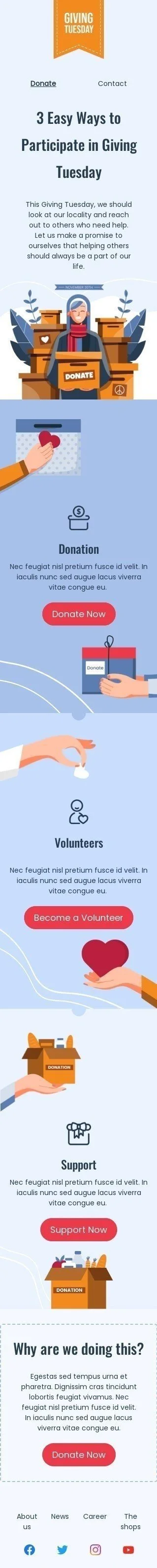 Make a difference this Giving Tuesday with our "3 Easy Ways" email template designed for the nonprofit industry. This customizable template features a simple yet effective design that highlights three ways in which recipients can contribute to your cause. Use this template to encourage donations and promote volunteer opportunities in a clear and concise manner. With a strong call-to-action button and a user-friendly design, this email template is sure to drive engagement and support for your cause. Don't miss the opportunity to make a meaningful impact with our "3 Easy Ways" email template.