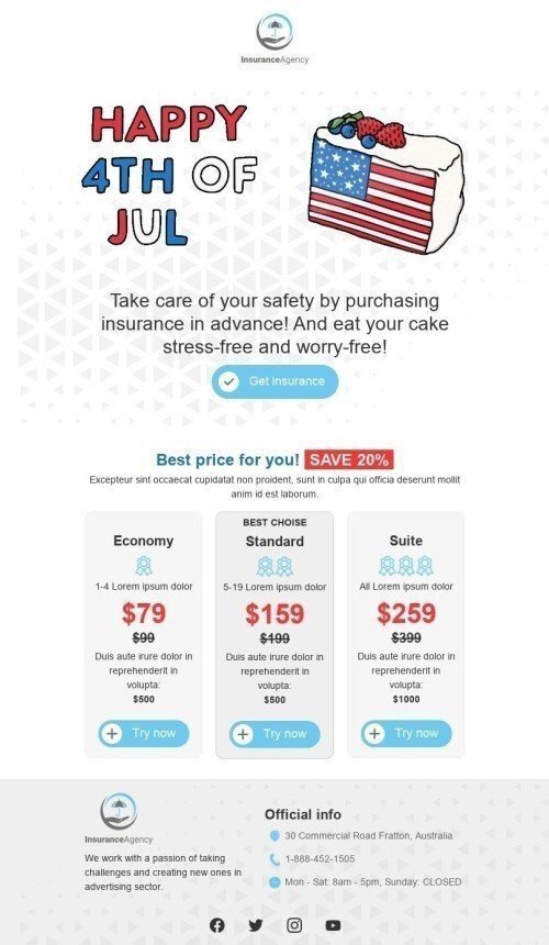 Feiern Sie Amerikas Geburtstag mit unserer E-Mail-Vorlage "Iss deinen Kuchen", die speziell für die Versicherungsbranche entwickelt wurde. Diese Vorlage besticht durch ein fröhliches und festliches Design und erinnert Ihre Zielgruppe perfekt daran, Kuchen zu genießen und den Unabhängigkeitstag zu feiern. Passen Sie sie mit Ihrem Branding und Ihrer Botschaft an, um Ihre Zielgruppe anzusprechen und Ihre Versicherungsleistungen zu bewerben. Nutzen Sie diese Gelegenheit, um Ihre Kunden daran zu erinnern, dass Sie für sie da sind und sie jederzeit schützen. Verpassen Sie nicht die Chance, mit unserer E-Mail-Vorlage "Iss deinen Kuchen die Kundenbindung und den Umsatz zu steigern.
