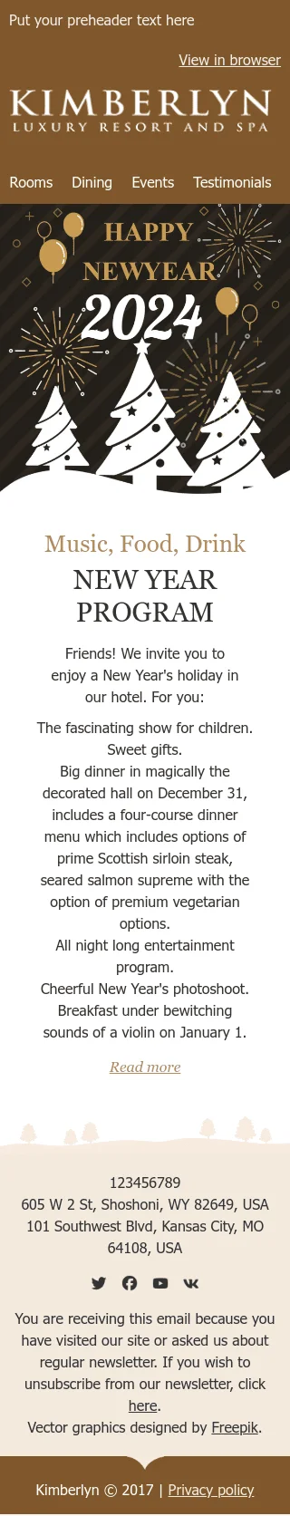 Begrüßen Sie das neue Jahr mit unserer E-Mail-Vorlage „Die Einladung“, die speziell für die Hotellerie entwickelt wurde. Diese individuell anpassbare Vorlage besticht durch ein warmes und einladendes Design und bietet Ihnen die Möglichkeit, Ihre Silvester-Angebote und -Specials optimal zu präsentieren. Nutzen Sie beeindruckende Bilder und ansprechende Inhalte, um Ihre Gäste zu einer Buchung und einer gemeinsamen Feier zu animieren. Dank des benutzerfreundlichen Formats erstellen Sie im Handumdrehen eine einzigartige Neujahrsnachricht, die die luxuriöse Ausstattung und den exzellenten Kundenservice Ihres Hotels hervorhebt. Laden Sie Ihre Gäste ein, mit unserer E-Mail-Vorlage „Die Einladung“ perfekt ins neue Jahr zu starten.