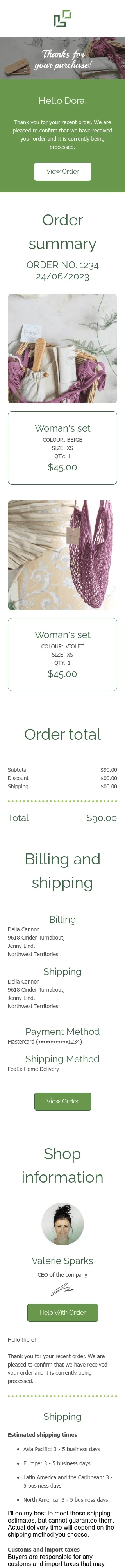 Auftragsbestätigung E-Mail-Vorlage «Danke für ihren Einkauf» für Beauty & Pflege-Branche