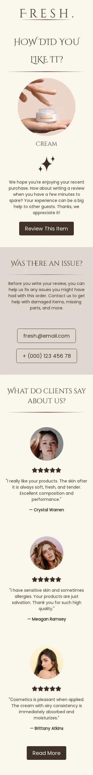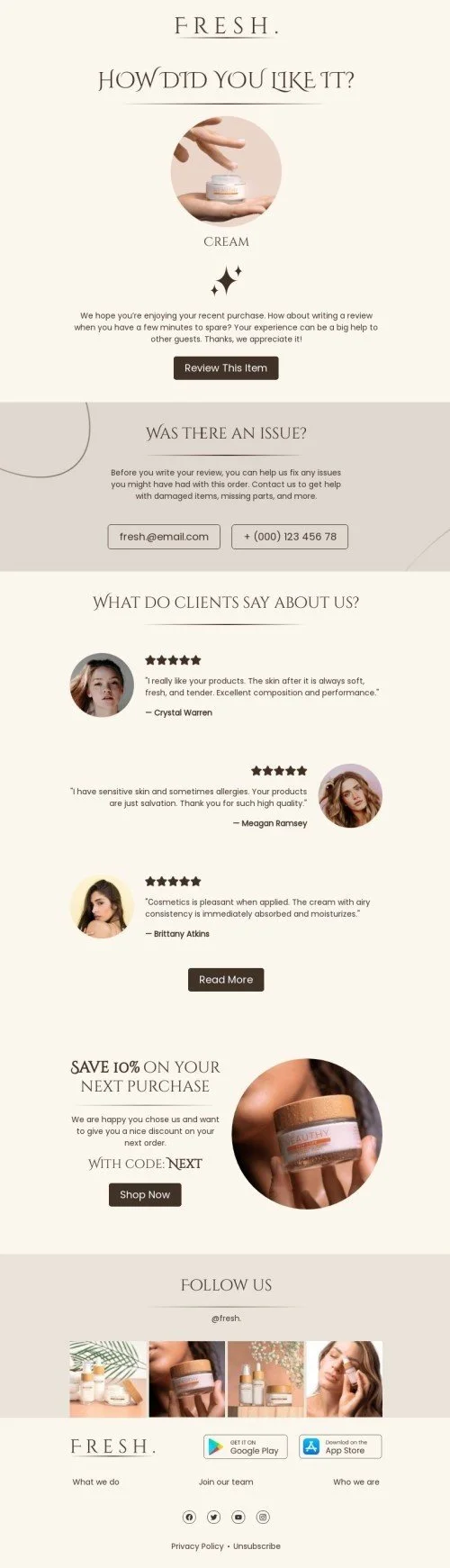 Werbung E-Mail-Vorlage «Wie hat es Dir gefallen?» für Beauty & Pflege-Branche