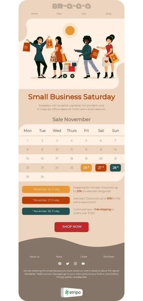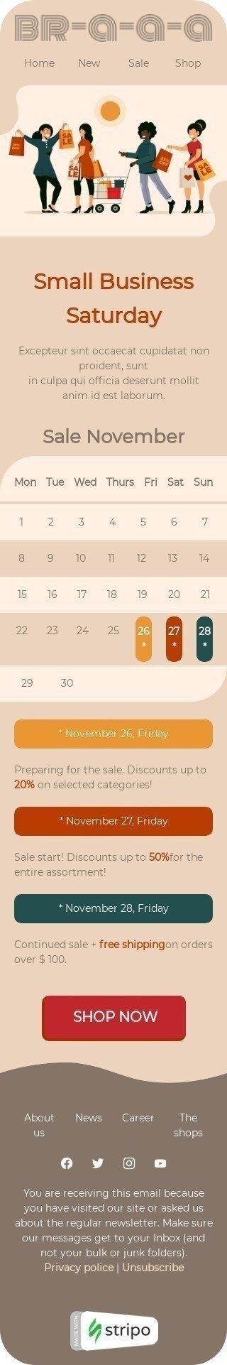 Bereiten Sie sich mit unserer "Vorbereitung auf den Verkauf" E-Mail-Vorlage auf den Small Business Saturday vor! Diese Vorlage ist perfekt für die Modebranche und bietet ein stilvolles und modernes Design, das die Aufmerksamkeit der Kunden auf sich ziehen wird. Die Vorlage enthält einen klaren call-to-action und einen Fokus auf die Vorbereitung auf den bevorstehenden Verkauf, was sie zur perfekten Möglichkeit macht, Ihre Marke zu fördern und Vorfreude auf den großen Tag zu erzeugen. Egal, ob Sie exklusive Angebote, Rabatte oder spezielle Aktionen anbieten, diese E-Mail-Vorlage wird Ihnen helfen, Kunden zu erreichen und sie auf den Small Business Saturday vorzubereiten. Lassen Sie uns also auf den Verkauf vorbereiten und kleine Unternehmen mit der "Vorbereitung auf den Verkauf" E-Mail-Vorlage feiern!