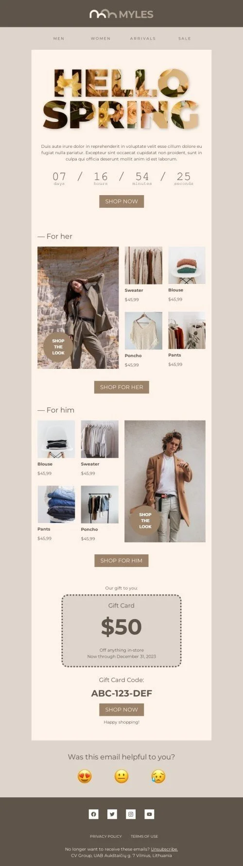 Unsere "Hello Spring" E-Mail-Vorlage ist der perfekte Weg, um die neueste Kollektion Ihrer Modemarke zu präsentieren und Kunden zu inspirieren, ihre Garderobe für die neue Saison aufzufrischen. Mit ihrem lebhaften Design und einladenden Sprache lädt diese Vorlage die Leser ein, Ihre Frühjahrs-Kollektion zu erkunden und die neuesten Trends zu umarmen. Anpassbar mit Ihrem eigenen Branding und Ihrer Botschaft, ist diese Vorlage ein effektiver Weg, um das Engagement zu steigern und Interesse an Ihren Produkten zu wecken. Ideal für Modehändler und Online-Shops, wird diese Vorlage Ihrer Marke helfen, sich im wettbewerbsintensiven Markt abzuheben und neue Kunden zu gewinnen.