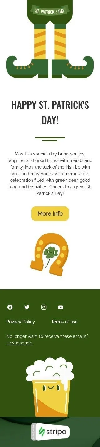 Holen Sie sich Glück an diesem St. Patrick's Day mit unserer "Hufeisen für gutes Glück" E-Mail-Vorlage! Perfekt für Unternehmen, die ihren Werbe-E-Mails an diesem Feiertag ein wenig Charme verleihen möchten. Diese anpassbare Vorlage verfügt über ein festliches grün-goldenes Design, komplett mit einer auffälligen Hufeisen-Grafik, die Glück symbolisiert. Verwenden Sie diese Vorlage, um Ihre St. Patrick's Day-Angebote zu bewerben oder einfach, um etwas Feiertagsfreude zu verbreiten. Lassen Sie Ihr Glück nicht dem Zufall überlassen - verwenden Sie unsere "Hufeisen für gutes Glück" E-Mail-Vorlage und erhöhen Sie die Engagement mit Ihren Kunden an diesem St. Patrick's Day!