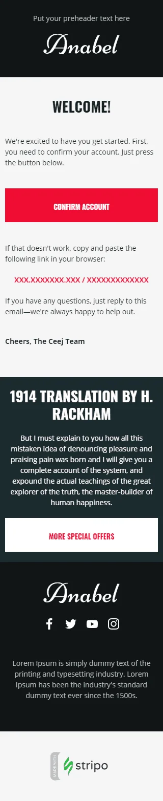 Unsere Willkommens-E-Mail-Vorlage "Klassische Begrüßung" soll Modeunternehmen dabei helfen, sich professionell bei neuen Kunden und Partnern vorzustellen. Mit dieser Vorlage können Sie sich auf herzliche und stilvolle Weise für das Interesse an Ihrer Marke bedanken und gleichzeitig einen Überblick über Ihre Produkte und Dienstleistungen geben. Dank dieser Vorlage etablieren Sie sich als modisches und anspruchsvolles Unternehmen und schaffen die Voraussetzungen für eine erfolgreiche und produktive Zusammenarbeit. Mit dieser Vorlage hinterlassen Sie einen guten ersten Eindruck und bauen eine Beziehung zu Ihren Kunden auf.