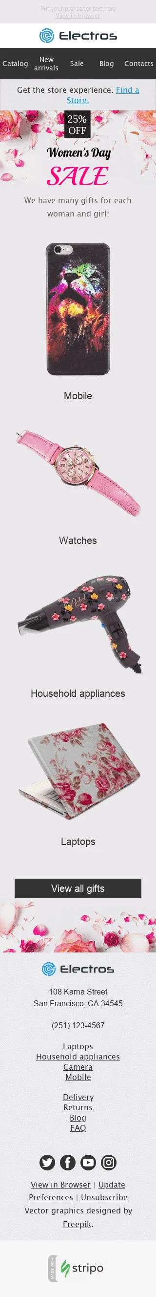 Weltfrauentag E-Mail-Vorlage "Blumenschmuck" für Elektronik & Gadgets-Branche