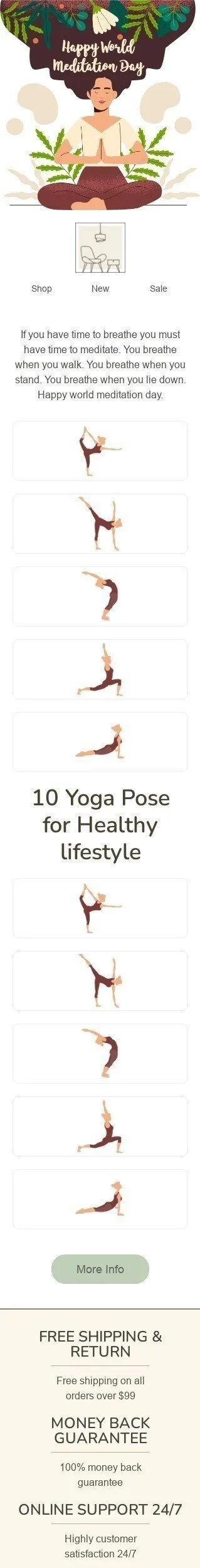 Find inner peace with our "10 Yoga Pose" World Meditation Day Email Template, designed exclusively for the Furniture, Interior & DIY industry. This email showcases our latest collection of yoga and meditation props, including mats, bolsters, and cushions. The template is fully customizable and includes images of our products, as well as a message encouraging customers to practice mindfulness and find balance in their lives. Ideal for promoting your World Meditation Day specials, this email will increase customer engagement and drive sales.