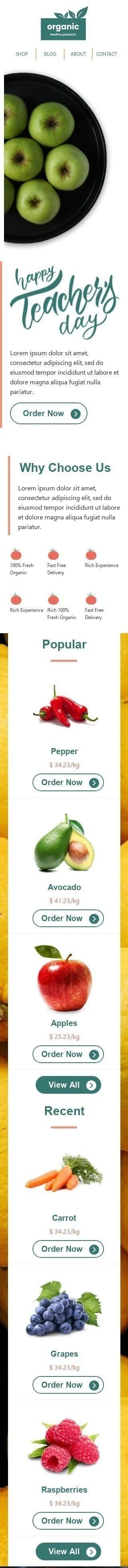 Feiern Sie den Weltlehrertag mit unserer "Reichen Erfahrung" E-Mail-Vorlage, die exklusiv für die Branche der Bio- und Ökogüter entwickelt wurde. Diese E-Mail enthält eine Botschaft, die das Engagement und die harte Arbeit der Lehrer würdigt und wie ihre Erfahrung dazu beigetragen hat, die Welt zu gestalten. Die Vorlage ist vollständig anpassbar und enthält Bilder unserer biologischen und umweltfreundlichen Produkte sowie ein spezielles Rabattangebot für Lehrer. Perfekt, um Ihre Produkte in der Bildungsgemeinschaft zu bewerben, wird diese E-Mail das Markenbewusstsein und die Loyalität unter Lehrern erhöhen. Bestellen Sie jetzt und zeigen Sie Ihre Wertschätzung für die fleißigen Pädagogen in Ihrem Leben!