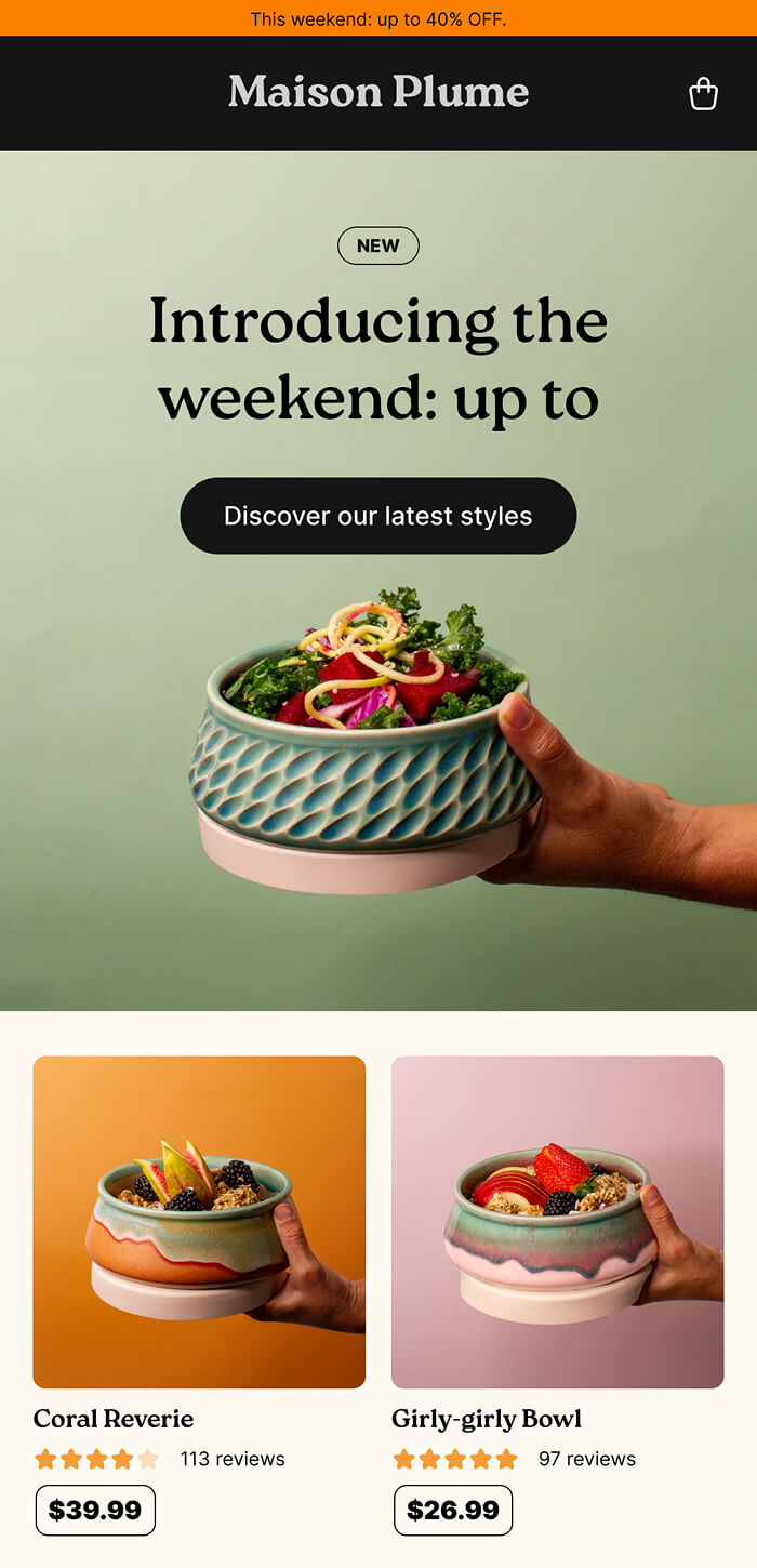 Haga que los correos electrónicos sean eficientes en espacio. Mostrar múltiples productos o características, aumentando la interacción y los clics mientras ahorra espacio valioso.»