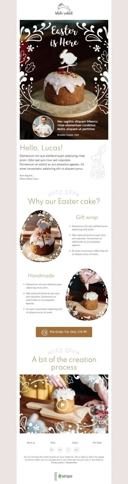 Celebrate Pascua con nuestro "Easter Cake" email template diseñado para la industria de restaurantes. Este template personalizable presenta un diseño delicioso que muestra tus últimos postres temáticos de Pascua y atrae a los suscriptores a disfrutar de dulces. Usa este template para ofrecer descuentos exclusivos, promover tu menú de vacaciones o compartir una receta para tu pastel de Pascua característico. Con un fuerte botón de llamada a la acción y un diseño visualmente atractivo, este email template seguramente impulsará el compromiso y aumentará tus ventas. No te pierdas la oportunidad de celebrar Pascua y deleitar a tu audiencia con nuestro email template que hace agua la boca.
