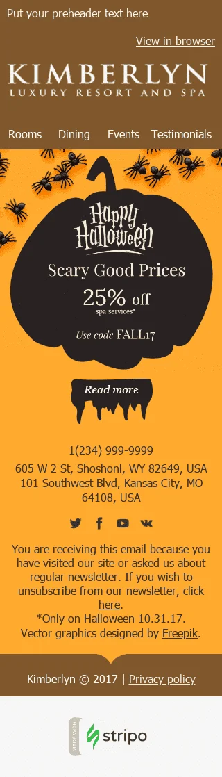 La "Calabaza Hermosa" Halloween email template es perfecta para la industria hotelera. Con su diseño elegante y atractivo, te permite mostrar tus promociones y eventos de Halloween. Ya sea que estés organizando una fiesta de disfraces espeluznante o ofreciendo una tarifa de habitación con descuento especial, esta plantilla te ayudará a captar la atención de tu audiencia y aumentar las ventas. Con elementos personalizables y un fuerte llamado a la acción, puedes aprovechar al máximo la temporada navideña y crear una campaña memorable para tus clientes.