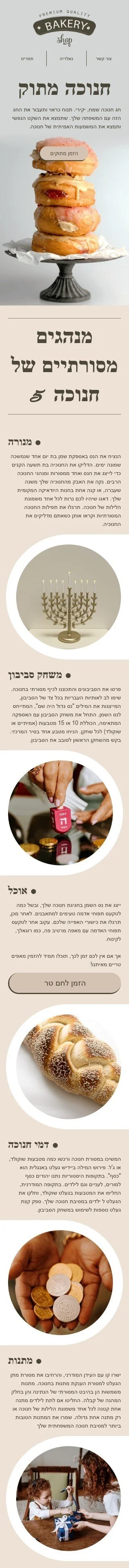 La plantilla de correo electrónico de Hanukkah "Dulce Hanukkah" es la manera perfecta para que las empresas de la industria alimentaria compartan su espíritu festivo y promocionen sus productos temáticos de Hanukkah. Esta plantilla de correo electrónico personalizable presenta un diseño colorido con deliciosos dulces navideños, junto con espacio para el logotipo y el mensaje de su negocio. Se puede utilizar para mostrar sus menús especiales de Hanukkah, promociones y ventas, y para desear a sus clientes una celebración de "Dulce Hanukkah". Ya sea que dirija una panadería, café, restaurante o cualquier otro negocio de alimentos, esta plantilla de correo electrónico le ayudará a interactuar con su audiencia y promocionar sus ofertas navideñas de una manera creativa y divertida.