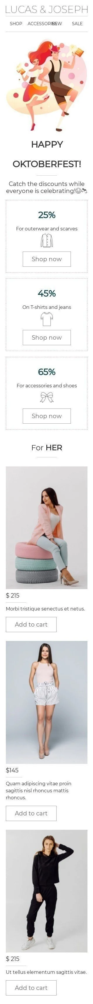 Embrace the spirit of Oktoberfest with our "Catch the discounts" email template for the fashion industry. With its lively and festive design, this template showcases your latest sales and descuentos, perfect for celebrating the season in style. Encourage customers to update their wardrobe for the occasion with clear llamadas a la acción and a focus on fashion trends. Whether you're promoting new arrivals, sales, or special events, this email template will help you reach customers and spread the joy of Oktoberfest. Don't miss the chance to catch the discounts and get festive with this email template!