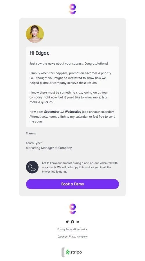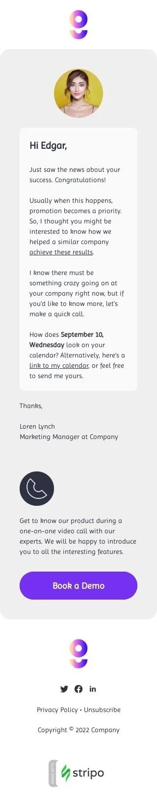 Nuestra plantilla de correo electrónico de divulgación "Conozca nuestro producto" está diseñada para ayudar a las empresas a presentar y promocionar sus productos a clientes potenciales. Esta plantilla ofrece una forma profesional y atractiva de mostrar las características y ventajas del producto, y animar a los clientes potenciales a examinarlo más de cerca. Con esta plantilla, puedes destacar las características clave del producto, proporcionar una breve descripción general de cómo el producto puede beneficiar al cliente e incluir un botón de llamada a la acción para obtener más información o solicitar una demostración. Utiliza esta plantilla para aumentar el compromiso y el interés en tu producto, y para llevar a los clientes potenciales a dar el siguiente paso para aprender más sobre el producto, y potencialmente convertirte en un cliente.