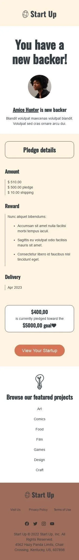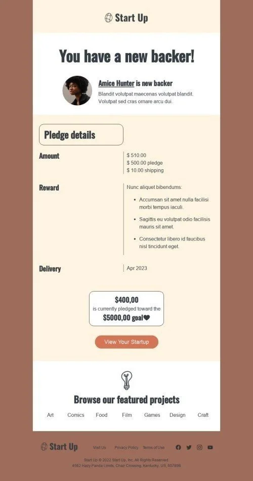 Plantilla de correo electrónico «Tienes un nuevo patrocinador» de Promoción para la industria de Micromecenazgo