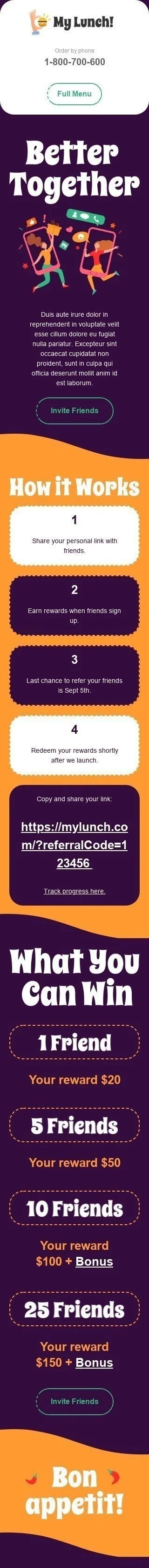 ¿Quieres impulsar tu programa de recomendación? Echa un vistazo a nuestra nueva plantilla de correo electrónico de recomendación "Better together" para el sector alimentario. El correo electrónico presenta un diseño llamativo y atrevido que sin duda destacará en las bandejas de entrada de tus clientes. Y con un mensaje que hace hincapié en las ventajas de recomendar tu negocio a amigos y familiares, seguro que animarás a más clientes a registrarse. Así que si estás buscando una forma de aumentar las recomendaciones y hacer crecer tu negocio, no dejes de echar un vistazo hoy mismo a nuestra nueva plantilla de correo electrónico de recomendación "Better together" para el sector alimentario!