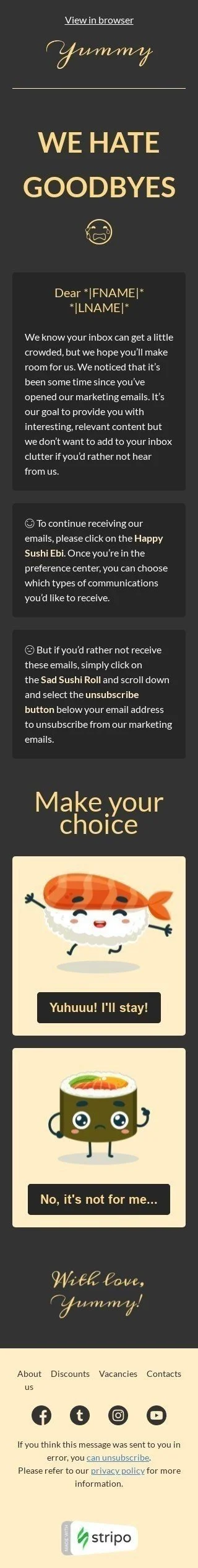 Plantilla de correo electrónico «Nosotros odiamos las despedidas» de Retención y reactivación para la industria de Gastronomía