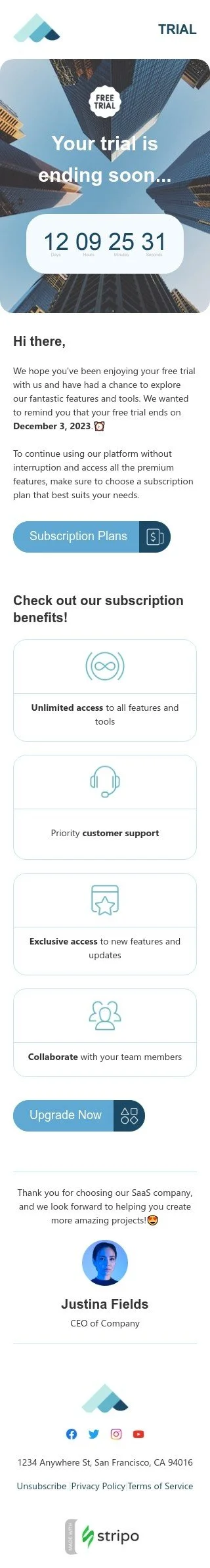 Plantilla de correo electrónico «Tu prueba terminará pronto» de SaaS para la industria de software y tecnología