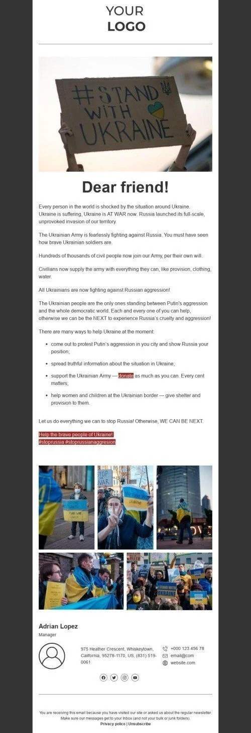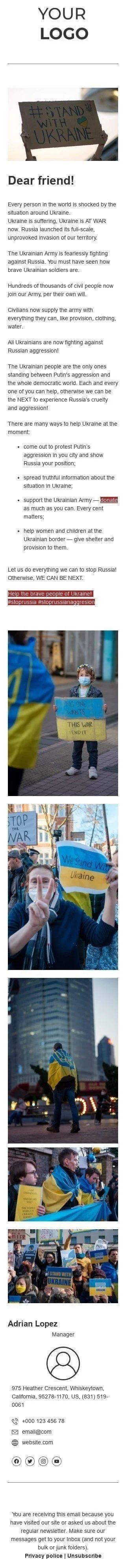 Nuestra plantilla de correo electrónico "Ayuda a Ucrania. No te quedes en silencio" está diseñada para crear conciencia y fomentar la acción para apoyar los esfuerzos para poner fin al conflicto en Ucrania. La plantilla presenta un diseño atractivo que enfatiza la importancia de hablar en contra del conflicto, con un mensaje claro y un llamado a la acción para que las personas se involucren y hagan la diferencia. Con contenido personalizable y gráficos visualmente atractivos, este correo electrónico es la herramienta perfecta para interactuar con tu audiencia y alentarlos a apoyar los esfuerzos para poner fin al conflicto. No te quedes en silencio, utiliza nuestra plantilla de correo electrónico impactante para hacer la diferencia hoy.