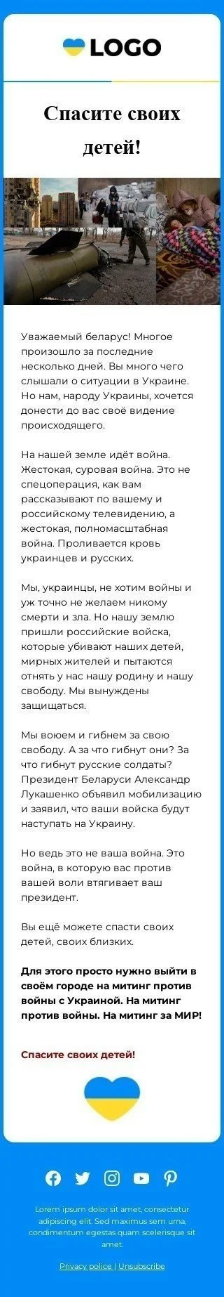 Nuestro "Save Children" plantilla de correo electrónico está diseñada para crear conciencia y apoyo para los esfuerzos de proteger a los niños afectados por el conflicto en curso en Ucrania. La plantilla presenta un diseño conmovedor que destaca la necesidad urgente de salvaguardar el bienestar de los niños, con un mensaje claro y un llamado a la acción para que las personas se involucren y ayuden. Con contenido personalizable y gráficos visualmente atractivos, este correo electrónico es la herramienta perfecta para interactuar con su audiencia y alentarlos a apoyar los esfuerzos para proteger a los niños en Ucrania. No se pierda esta oportunidad de hacer una diferencia con nuestra plantilla de correo electrónico impactante.