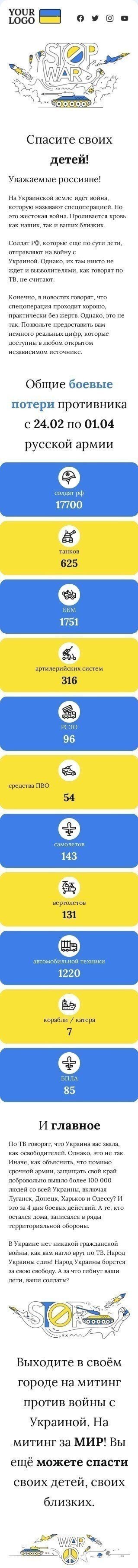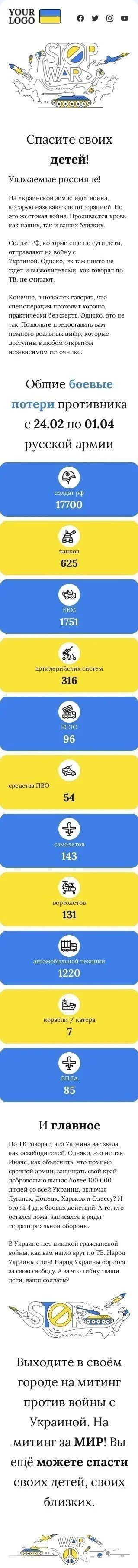 Nuestro plantilla de correo electrónico "Salva a los Niños de Rusia" está diseñada para crear conciencia y apoyo para la crisis en curso que afecta a los niños en Ucrania debido a la guerra. La plantilla presenta un diseño convincente que enfatiza la urgencia de la situación, con un mensaje claro y un llamado a la acción para que las personas tomen medidas y ayuden. Con contenido personalizable y gráficos visualmente atractivos, este correo electrónico es la herramienta perfecta para interactuar con su audiencia y alentarlos a involucrarse en el apoyo a esta causa. No pierda esta oportunidad de hacer una diferencia y apoyar a los niños de Ucrania con nuestra plantilla de correo electrónico impactante.