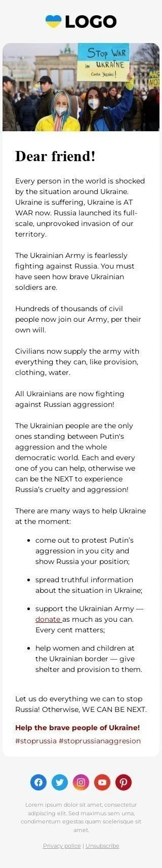 El "Plantilla de correo electrónico para Detener la Agresión Rusa" está diseñada para crear conciencia y fomentar la acción para poner fin al conflicto en curso en Ucrania causado por la agresión rusa. La plantilla presenta un diseño poderoso que enfatiza la importancia de tomar una posición contra esta agresión, con un mensaje claro y un llamado a la acción para que las personas se involucren y apoyen los esfuerzos para poner fin al conflicto. Con contenido personalizable y gráficos visualmente atractivos, este correo electrónico es la herramienta perfecta para interactuar con su audiencia e inspirarlos a actuar. No pierda esta oportunidad de hacer una diferencia con nuestra plantilla de correo electrónico impactante.