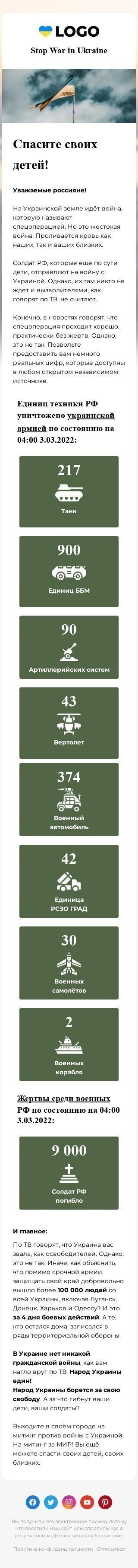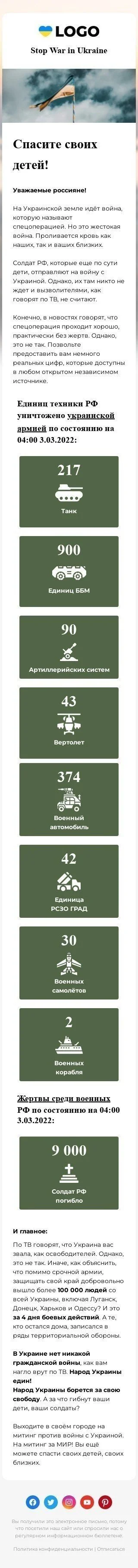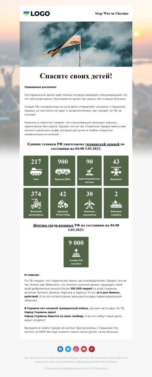 Para aquellos que buscan crear conciencia y apoyo por el conflicto en curso en Ucrania, nuestra plantilla de correo electrónico "Podemos Detener Esto Ahora" es la solución perfecta. Su diseño poderoso y su mensaje claro, junto con un fuerte llamado a la acción, enfatizan efectivamente el impacto del conflicto e inspiran a las personas a actuar. Esta plantilla cuenta con contenido personalizable y gráficos visualmente atractivos, lo que la convierte en la herramienta ideal para interactuar con su audiencia y alentarlos a apoyar los esfuerzos para poner fin al conflicto. No dejes que esta oportunidad se te escape. Usa nuestra plantilla de correo electrónico impactante para hacer una diferencia y apoyar la causa en Ucrania.
