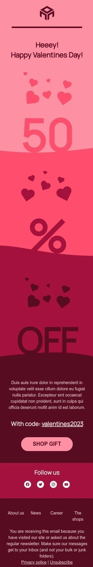 Nuestra plantilla de correo electrónico para San Valentín "Lluvia de corazones" está diseñada para ayudar a las empresas de moda a promocionar sus productos y servicios para el Día de los Enamorados. Esta plantilla ofrece una forma atractiva y atractiva de mostrar artículos de moda románticos como ropa, accesorios y joyas. Incluye un diseño único con una lluvia de corazones cayendo, lo que la hace perfecta para el Día de San Valentín. Con esta plantilla, puedes incluir imágenes de alta calidad de tus productos, junto con información sobre materiales, tallas y precios. También puedes incluir un botón de llamada a la acción para facilitar a los clientes la compra. Utiliza esta plantilla para ayudar a tus clientes a encontrar el regalo perfecto para San Valentín y aumenta las ventas y el compromiso de los clientes.