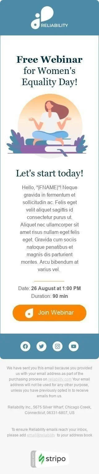 Plantilla de correo electrónico «Recordatorio por una hora» de Día Internacional de la Mujer para la industria de Seminarios en línea