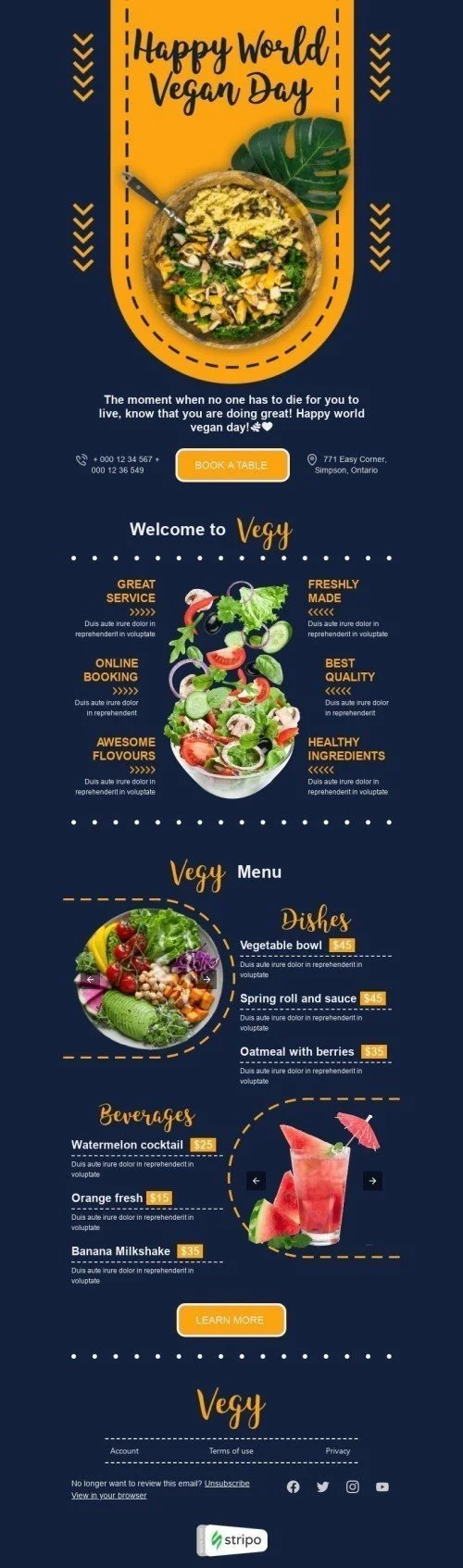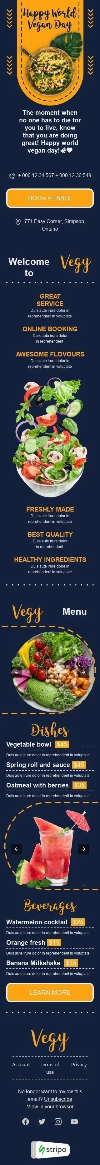 Introduce la cocina vegana de tu restaurante con nuestra plantilla de correo electrónico "Restaurante Vegano", diseñada para el Día Mundial del Veganismo. Esta plantilla personalizable presenta imágenes de deliciosos platos a base de plantas y es ideal para promocionar tu menú vegano a los suscriptores. Usa este correo electrónico para involucrar a tu audiencia con descuentos exclusivos y aumentar la visibilidad de tu negocio como un destino preferido para la comida vegana. Celebra el Día Mundial del Veganismo compartiendo tu pasión por la alimentación sostenible y saludable con esta plantilla de correo electrónico visualmente atractiva, y anima a tus suscriptores a unirse a ti en este viaje culinario.