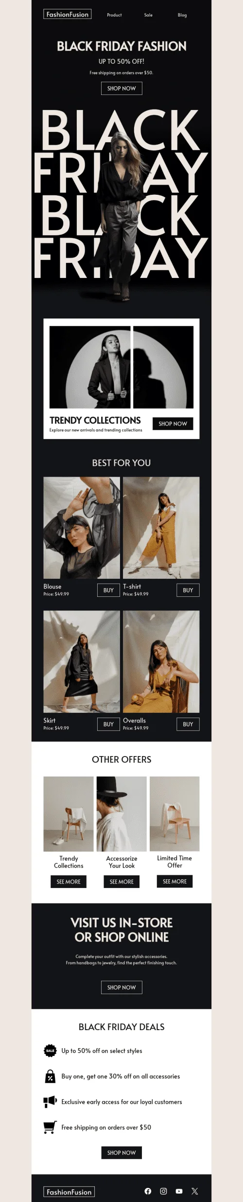 Préparez-vous pour le shopping ultime avec notre modèle d'email "Offres de mode du Black Friday". Il est conçu exclusivement pour les passionnés de mode, avec une mise en page chic, un contenu personnalisable et un accent sur les réductions exclusives et les collections tendance. Cet email est votre billet pour guider les clients vers les meilleures affaires de mode du Black Friday. Conçu avec flair et efficacité, il les invite à découvrir les derniers styles et économies. Assurez-vous que votre marque se démarque ce Black Friday avec notre modèle d'email professionnel et captive les fashionistas avec des offres imbattables.