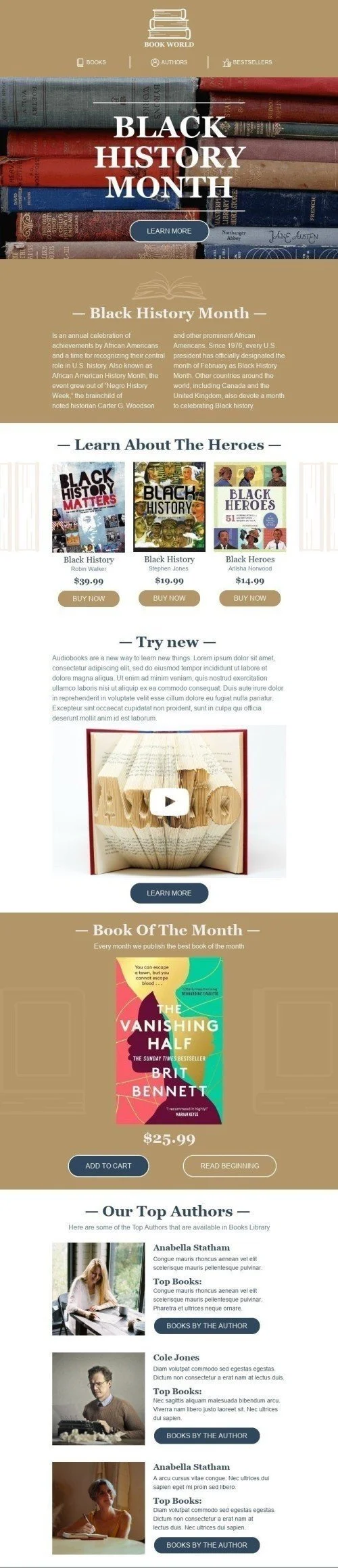 Pour les entreprises du secteur des livres, des cadeaux et de la papeterie cherchant à célébrer le Mois de l'Histoire des Noirs, le modèle d'email "Héros Noirs" est un excellent choix. Son design inspirant présente des images marquantes de héros noirs influents, avec beaucoup d'espace pour votre logo et votre message. Utilisez-le pour mettre en valeur vos collections spéciales, promotions et ventes, et pour inspirer vos clients à célébrer et à en apprendre davantage sur l'histoire des Noirs. Ce modèle d'email personnalisable convient aux entreprises vendant des livres, des cadeaux, de la papeterie et d'autres produits connexes. Il vous aidera à interagir avec votre public et à promouvoir vos offres du Mois de l'Histoire des Noirs de manière significative et percutante.