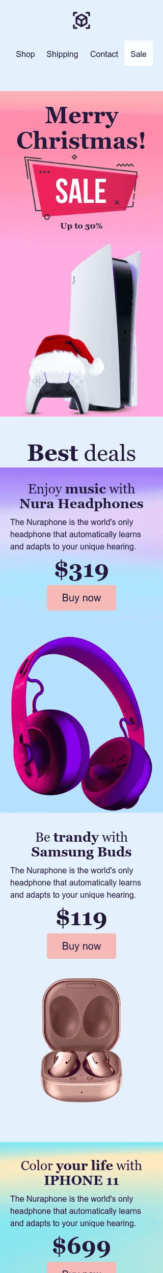 Rendez les Noël de vos proches spéciaux avec notre modèle d'email "Meilleurs Cadeaux" conçu pour l'industrie des gadgets. Ce modèle personnalisable comprend des sections pour mettre en valeur vos derniers gadgets et promotions, parfait pour la saison des fêtes. Ajoutez une touche personnelle en offrant une réduction de Noël ou message personnalisé pour montrer votre appréciation à vos clients. Le design festif et moderne de ce modèle est sûr d'engager et d'inspirer votre public. Avec son format facile à utiliser, vous pouvez créer un message de Noël unique qui met en avant les offres de votre marque et son engagement à fournir les meilleurs cadeaux pour vos proches.