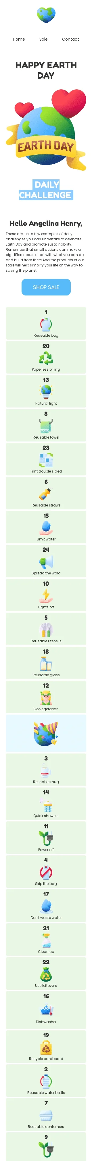 Looking for a way to celebrate Earth Day and inspire sustainable practices among your customers in the fashion industry? Look no further than our "Daily Challenge" email template. Featuring an eco-friendly design that reflects the importance of protecting the environment, this template includes customizable content and visually appealing graphics to encourage viewers to participate in a daily challenge to reduce their environmental impact. From recycling to reducing plastic use, the clear call-to-action will motivate your customers to join the movement towards sustainability. Don't miss out on the chance to make a positive impact with our professional and impactful email template.