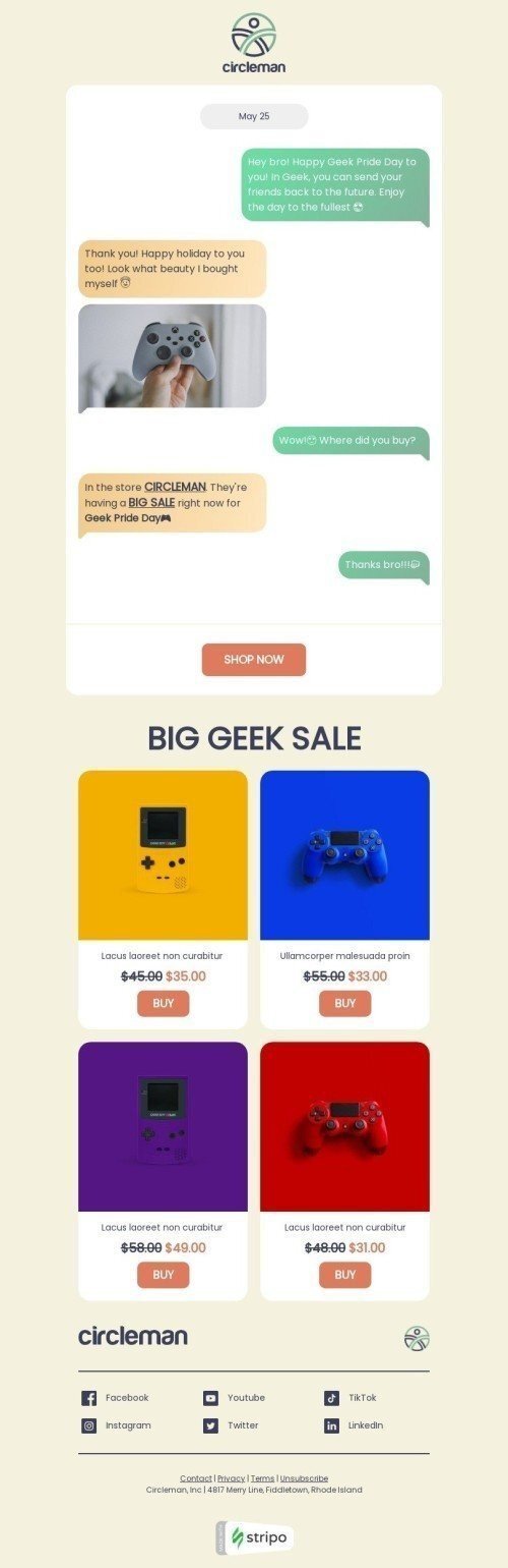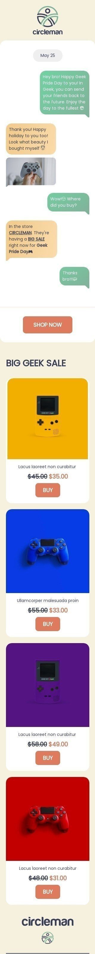 Célébrez le Geek Pride Day avec notre modèle d'email "Discuter avec un ami" conçu pour l'industrie des gadgets. Ce modèle personnalisable présente un design amusant qui invite les abonnés à discuter avec un ami geek des dernières tendances technologiques et gadgets. Utilisez ce modèle pour présenter vos derniers gadgets et offrir des promotions spéciales à votre public technophile. Avec un fort bouton d'appel à l'action et un design visuellement attrayant, ce modèle d'email est sûr de stimuler l'engagement et d'augmenter vos ventes. Ne manquez pas l'occasion de célébrer le Geek Pride Day et de vous connecter avec votre public grâce à notre modèle d'email engageant.