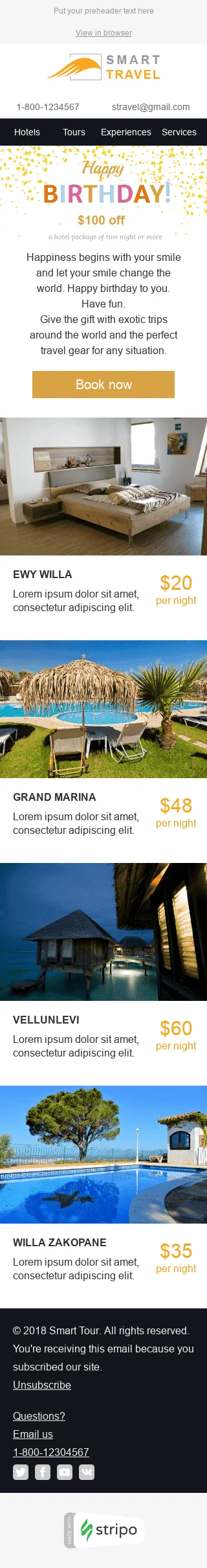 Notre modèle d'e-mail d'anniversaire "Voyage parfait" est conçu pour aider les entreprises touristiques à promouvoir leurs options de voyage d'anniversaire. Ce modèle offre une façon personnalisée et passionnante de célébrer le jour spécial de la personne aimée, et de présenter les expériences de voyage d'anniversaire uniques et inoubliables que votre entreprise propose. Avec ce modèle, vous pouvez présenter les différentes destinations, activités et forfaits spéciaux qui sont parfaits pour célébrer un anniversaire et encourager les gens à planifier un voyage unique et mémorable. Utilisez ce modèle pour stimuler l'engagement et les ventes de vos offres de voyages d'anniversaire.