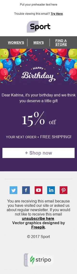 Notre modèle d'e-mail d'anniversaire "Fête enjouée" est conçu pour aider les entreprises sportives à promouvoir leurs options de célébration d'anniversaire. Ce modèle offre une façon vivante et festive de célébrer le jour spécial de la personne aimée et de présenter les cadeaux d'anniversaire uniques et excitants offerts par votre entreprise. Avec ce modèle, vous pouvez présenter vos produits et services liés au sport, comme les séances d'entraînement, l'équipement ou les billets d'entrée à des événements, et encourager les gens à marquer l'occasion par une célébration d'anniversaire active et mémorable. Utilisez ce modèle pour stimuler l'engagement et les ventes de vos offres de célébration d'anniversaire.