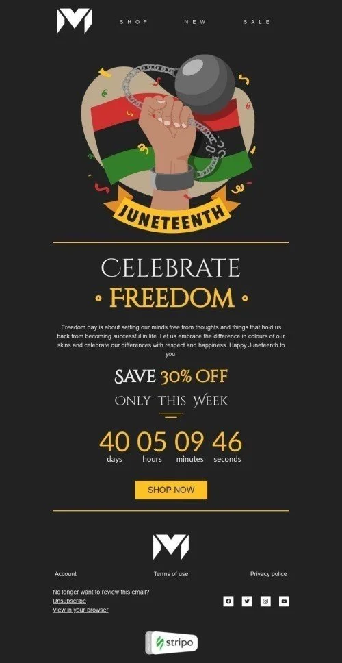 Célébrez Juneteenth et montrez votre soutien à la communauté afro-américaine avec notre modèle d'email "Célébrer la liberté" pour l'industrie des boissons. Ce modèle présente un design coloré avec un message clair sur l'importance de Juneteenth et un appel à l'action encourageant les clients à soutenir les entreprises détenues par des Noirs. Le modèle comprend des sections pour des promotions, des produits en vedette et des mises à jour. Il est entièrement personnalisable, vous pouvez donc facilement ajouter votre propre marque et message. Utilisez ce modèle d'email pour vous connecter avec vos clients et montrer votre engagement envers l'égalité et la justice.