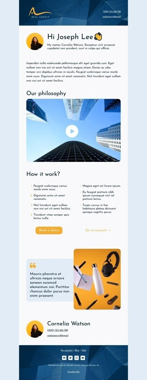Notre modèle d'e-mail de sensibilisation "Réserver une démonstration" est conçu pour aider les entreprises à programmer une démonstration de leur produit ou service à des clients potentiels. Ce modèle offre une manière professionnelle et attrayante d'inviter des clients potentiels à une démonstration de produit, et comprend un bouton d'appel à l'action pour faciliter la réservation d'un créneau horaire. Grâce à ce modèle, vous pouvez mettre en avant les caractéristiques et les avantages du produit et donner un bref aperçu de ce que le client peut s'attendre à voir au cours de la démonstration. Utilisez ce modèle pour susciter l'engagement et l'intérêt à l'égard de votre produit et pour fixer une date à laquelle les clients potentiels pourront en savoir plus et voir le produit en action, ce qui augmentera les chances de conclure une vente.