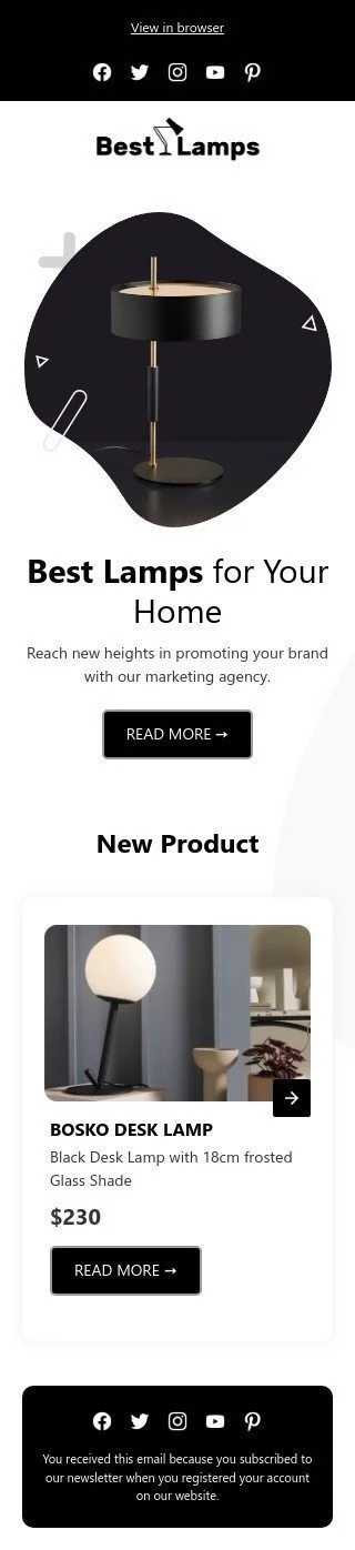 Le modèle d'e-mail "Les meilleures lampes pour votre maison" dispose d'un design magnifique et épuré qui ne manquera pas de capter l'attention de vos clients. Il est entièrement personnalisable et est fourni avec un éditeur glisser-déposer afin que vous puissiez facilement le modifier pour qu'il corresponde à l'apparence de votre marque. Il comprend aussi toutes les informations essentielles que vos clients doivent connaître sur le lancement de votre nouveau produit, telles que les spécifications du produit, le prix, la disponibilité, etc. Alors n'attendez pas, utilisez dès aujourd'hui le modèle d'e-mail d'annonce de lancement de produit "Les meilleures lampes pour votre maison" !