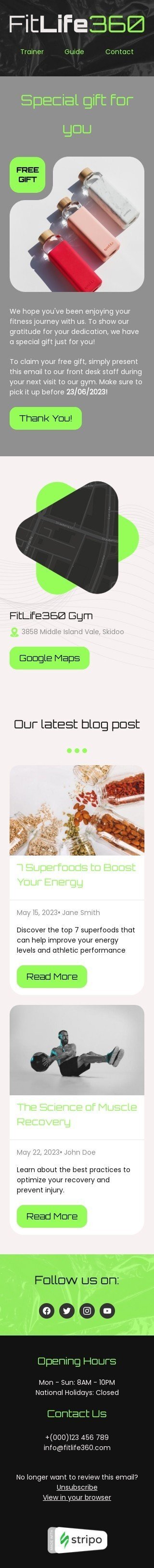 Notre "Cadeau Gratuit pour les Clients" promo email template est l'outil parfait pour les entreprises de santé et de bien-être pour montrer leur appréciation et fournir un incitatif supplémentaire à leurs précieux clients. Le modèle présente un design accrocheur qui met en avant l'offre de cadeau gratuit, avec un contenu personnalisable et des graphiques visuellement attrayants. En utilisant ce modèle d'email, les entreprises peuvent surprendre et ravir leurs clients, les encourageant à poursuivre leur parcours de bien-être. Ne manquez pas l'occasion de renforcer la fidélité des clients et de stimuler l'engagement avec notre modèle d'email promo professionnel et percutant. Offrez un geste de gratitude et gardez vos clients motivés et satisfaits.