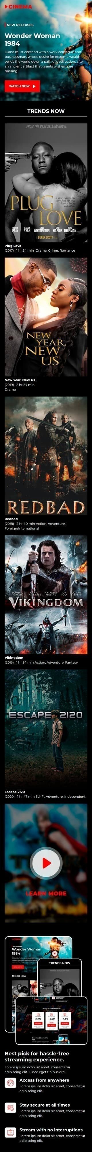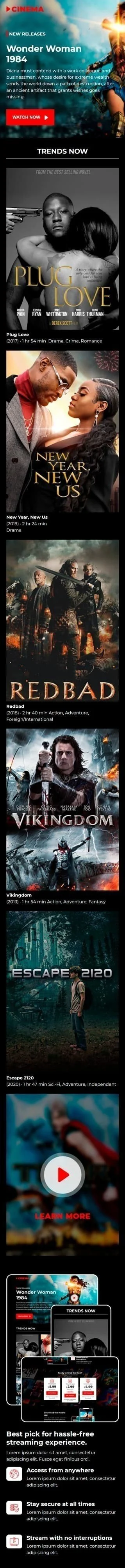 Découvrez notre modèle d'e-mail promotionnel "Home Cinéma", spécialement conçu pour l'industrie cinématographique. Ce modèle est idéal pour promouvoir vos dernières sorties de films, vos services de streaming ou votre équipement home cinéma. Grâce à son design moderne et attrayant, captez facilement l'attention de vos clients et suscitez l'enthousiasme autour de vos offres. Entièrement personnalisable, ce modèle vous permet d'y intégrer votre logo et votre message pour une communication unique. Prenez une longueur d'avance sur la concurrence et fidélisez vos clients avec notre modèle d'e-mail promotionnel "Home Cinéma".