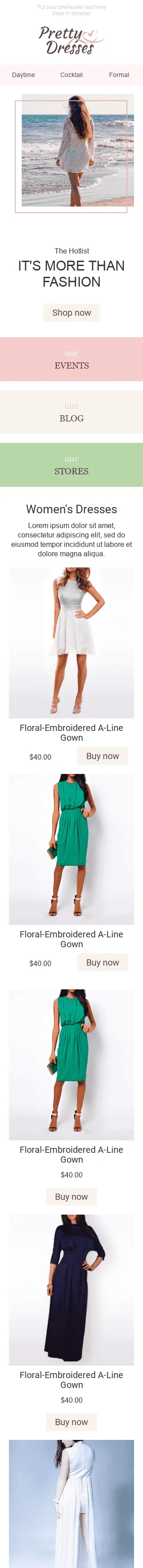 Introducing our "Pretty Dresses" promo email template, perfect for showcasing your latest collection in the fashion industry. With a beautifully designed template and compelling messaging, you can promote your dresses and encourage your subscribers to update their wardrobes for the season. Whether you're featuring new arrivals or highlighting a sale, this template is perfect for increasing engagement and driving sales. Stand out from the crowd and attract new customers with this visually appealing and persuasive template. Try it out today and watch your fashion business flourish.