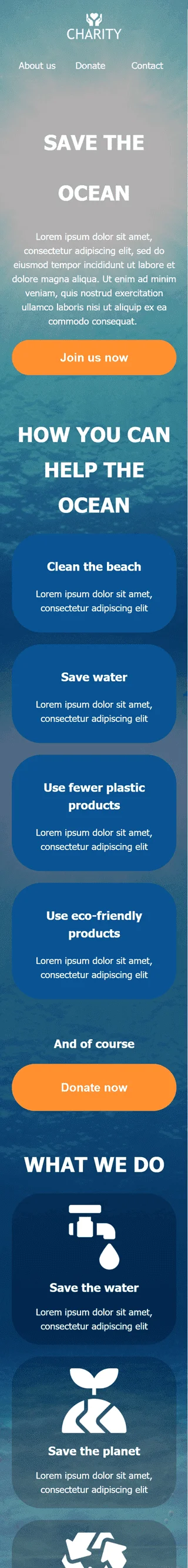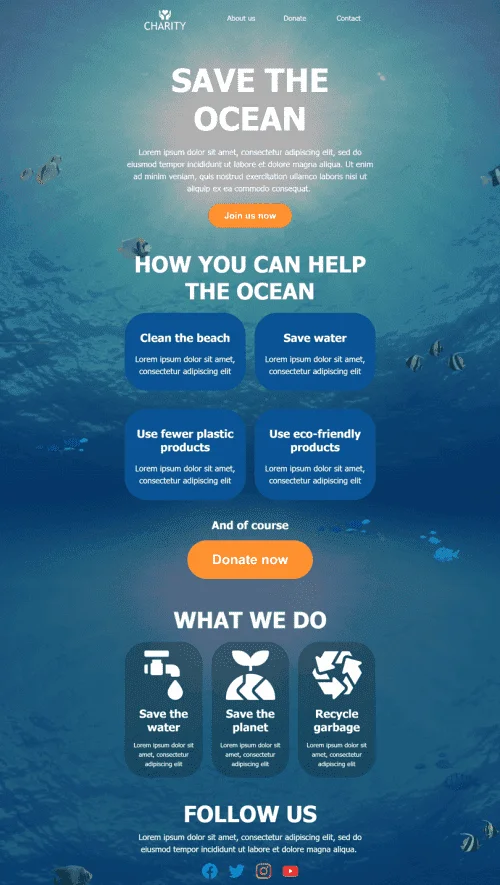Modèle de courrier électronique Promo «Sauvez l'océan» pour le secteur Association à but non lucratif et caritative