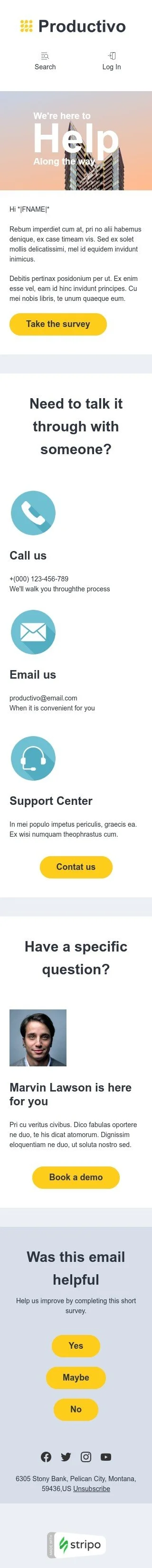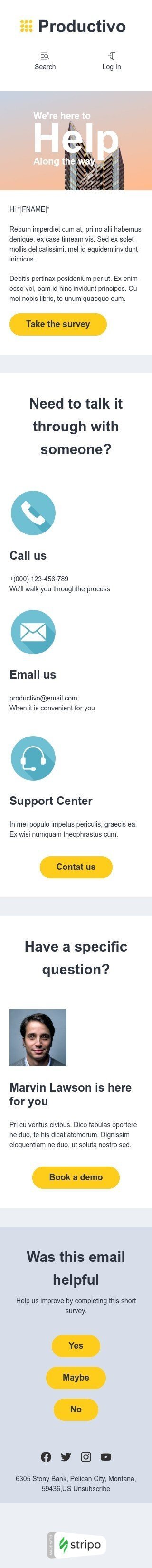 Faites ressortir votre entreprise avec le "Nous sommes là pour vous aider en cours de route" promo email template. Ce modèle personnalisable est conçu pour vous aider à établir la confiance avec vos clients et clients potentiels. Avec un ton amical et serviable, vous pouvez communiquer votre engagement à fournir un service client et un soutien de premier ordre. Que vous promouviez un nouveau produit ou que vous contactiez simplement des clients, ce modèle peut vous aider à vous connecter avec votre audience et à établir une relation positive. Alors pourquoi attendre ? Essayez le "Nous sommes là pour vous aider en cours de route" promo email template aujourd'hui et commencez à construire la fidélité des clients.