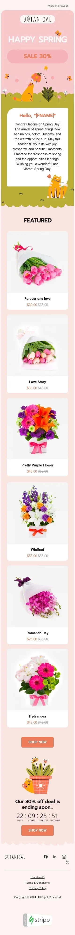 Embrassez la beauté du printemps avec notre modèle d'email "Fleurs de Printemps", conçu pour l'industrie des cadeaux et des fleurs. Ce modèle déborde de la vitalité de la saison, mettant en valeur de superbes arrangements floraux et des bouquets saisonniers. Partagez des offres exclusives de printemps, des idées de cadeaux ou des options de livraison de fleurs sans effort. Que ce soit pour des anniversaires, des mariages ou des occasions spéciales, ce modèle simplifie la communication et établit la norme pour des emails printaniers captivants dans l'industrie des cadeaux et des fleurs. Faites confiance à son efficacité pour enchanter votre audience et égayer leur journée avec la joie des fleurs de printemps.
