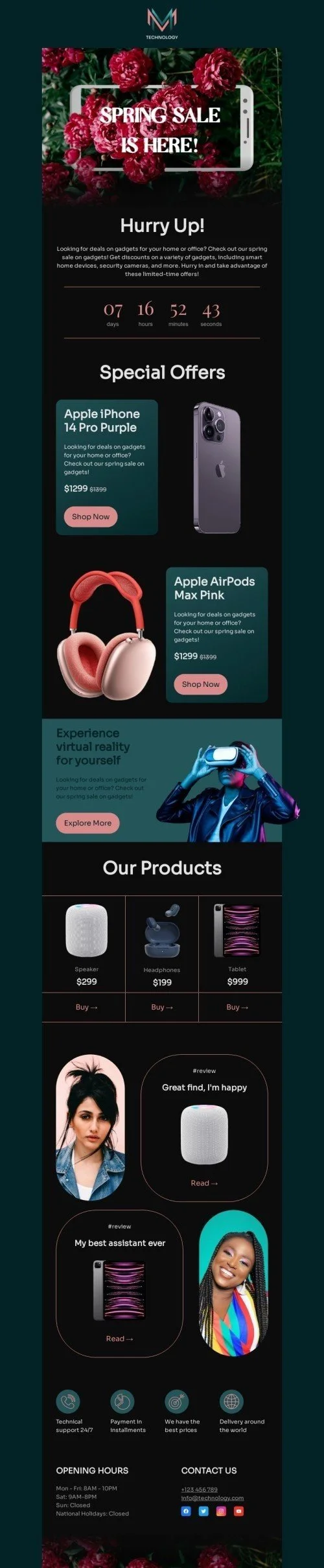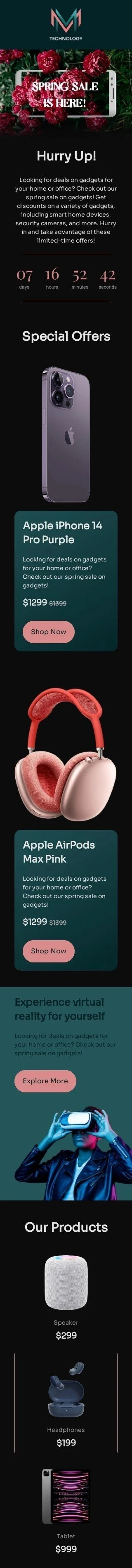 Printemps into savings with our "Spring Sale is Here" email template designed for the gadgets industry. This customizable template features a fresh and modern design, with bright colors and eye-catching gadget imagery that will appeal to your tech-savvy subscribers. Use this template to promote your Spring sales and special offers. With a strong call-to-action button and a clean design, this email template is sure to drive engagement and increase conversions. Don't miss this opportunity to showcase your Spring deals and discounts with our "Spring Sale is Here" email template.